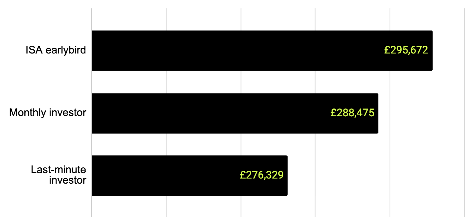 In our hypothetical world, our ISA earlybird invests their full allowance on 6 April each year and ends up with £295,672 after 10 years, having invested a total of £200,000. Our monthly investor, who waits for payday and then puts their £1,666.67 into the market at 12 regular intervals each year, ends up with £288,475 over the decade. Our final investor waits until the last second each tax year and invests just before the 5 April ISA deadline. They finish with £276,329 after 10 years.
