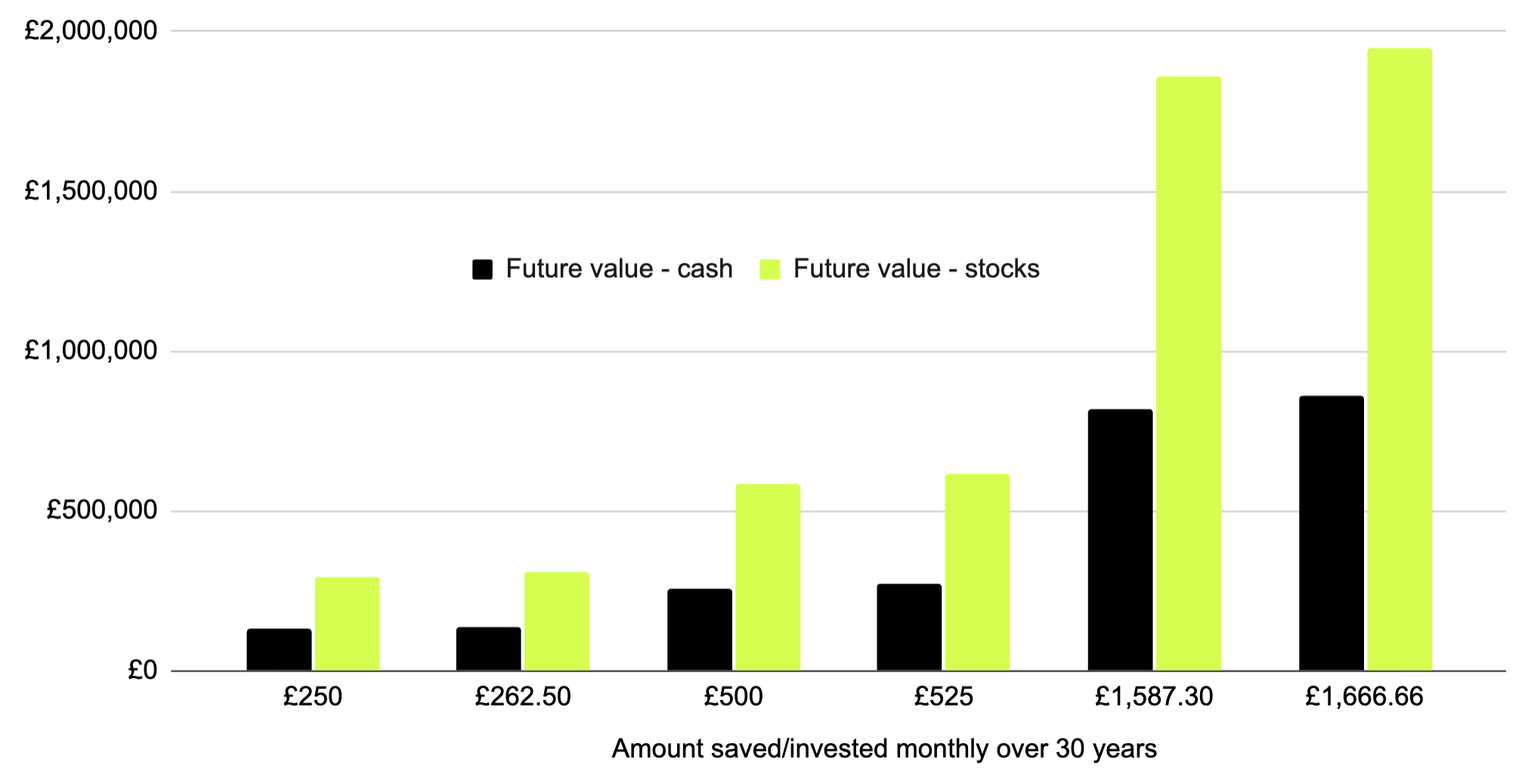 Let’s say we have a 30 year-old who wants to pay off their mortgage in 30 years without dipping into their pension. Maybe it’s more about building a pot to bridge the gap between working life and the state pension kicking in. Whatever the goal and their ability to invest, the evidence is clear that little changes now can snowball over time.