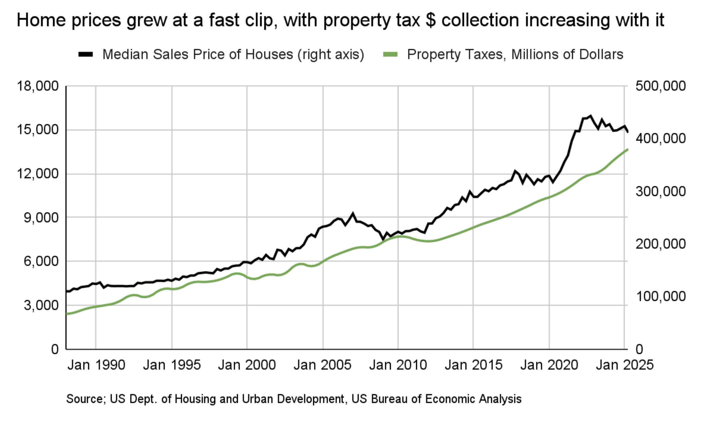 Finally, property taxes are a function of property values. You can see while property taxes have become an increasing part of a family’s costs in home ownership, it’s really because property prices shot up.