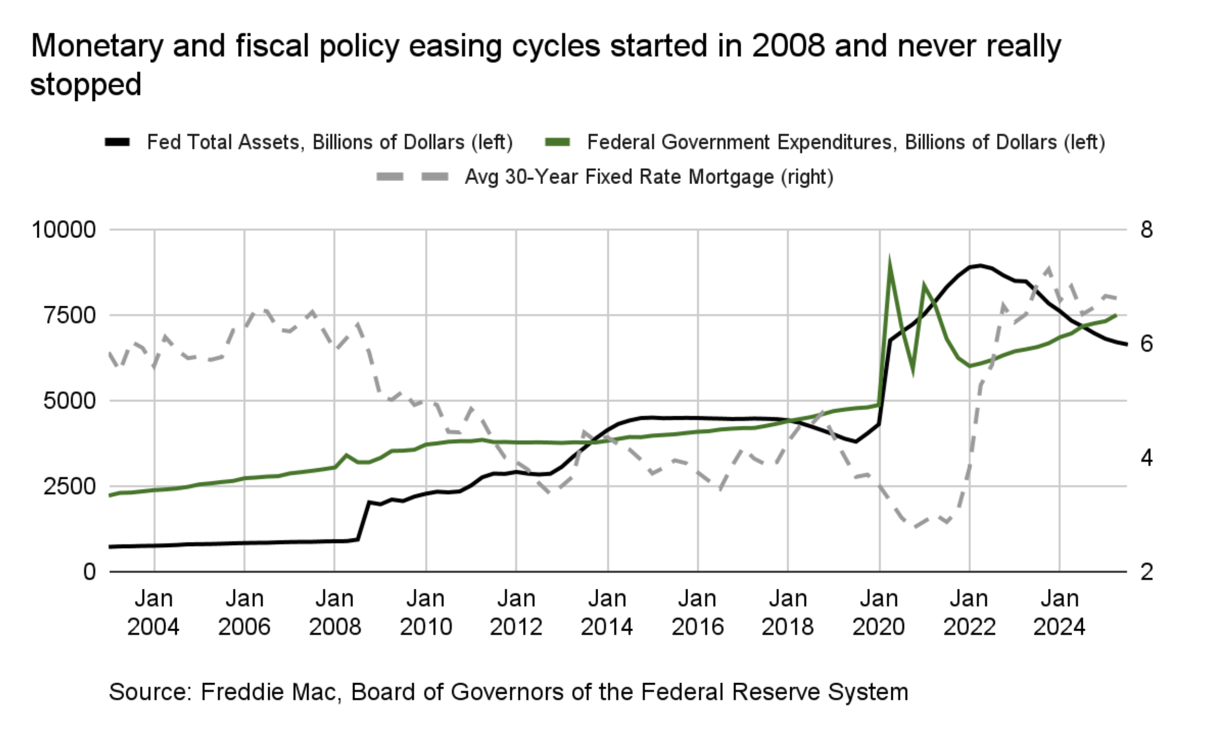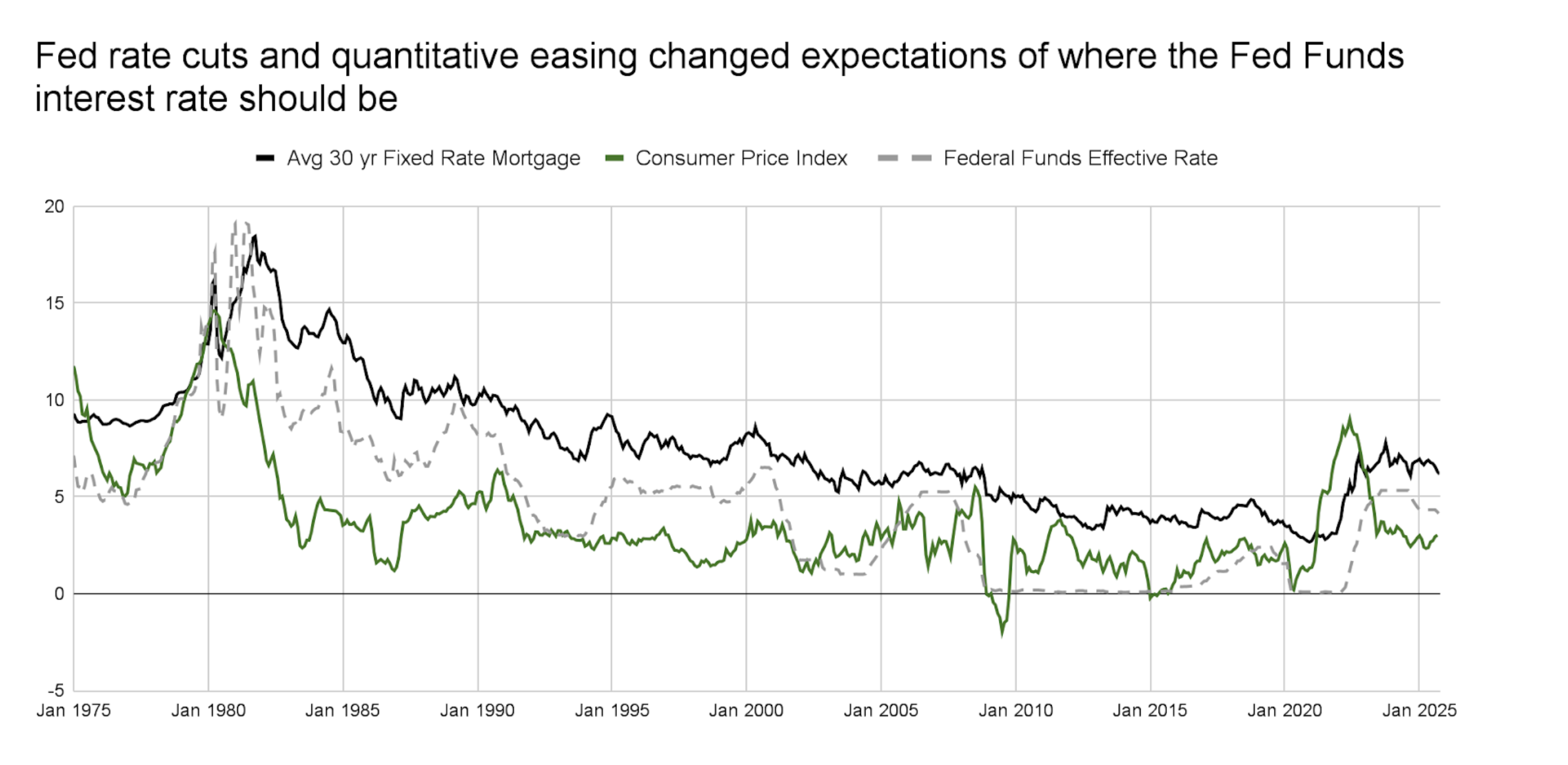 Low Fed Funds interest rates and quantitative easing to reduce longer term rates became ongoing, not temporary. Mortgage rates dropped from around 6% pre-2008 to as low as 3% in 2021.