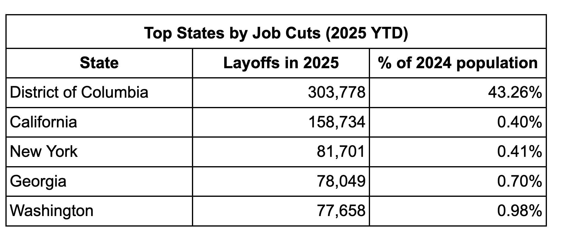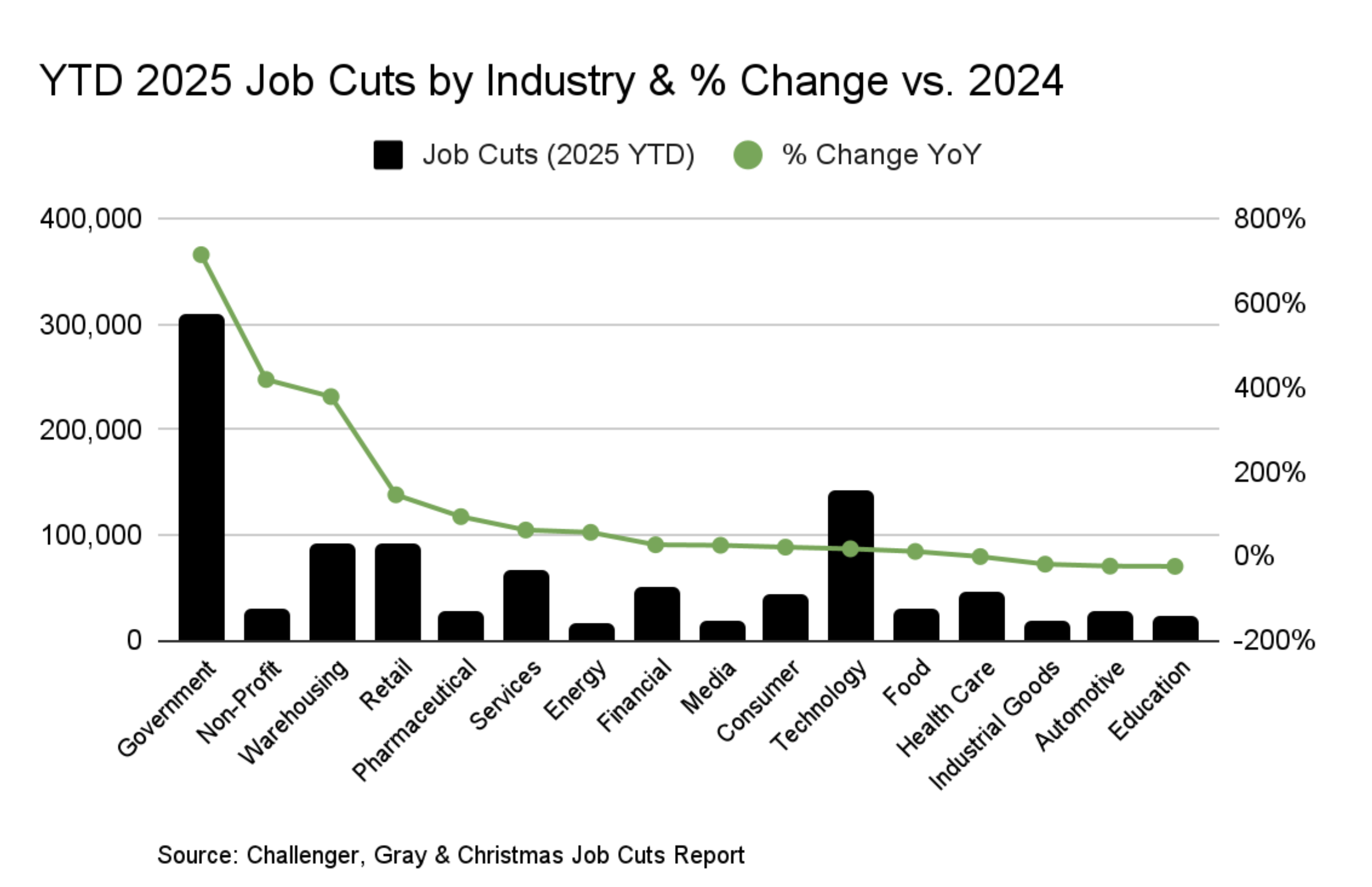 As illustrated above, February and March 2025 saw massive layoffs — over 447,000 cuts combined — largely from federal and contractor reductions under the so-called DOGE Impact. After a calmer summer, October delivered a second wave of 153,000 cuts, driven by cost-cutting across private industries, more cuts during the government shutdown, and AI.
