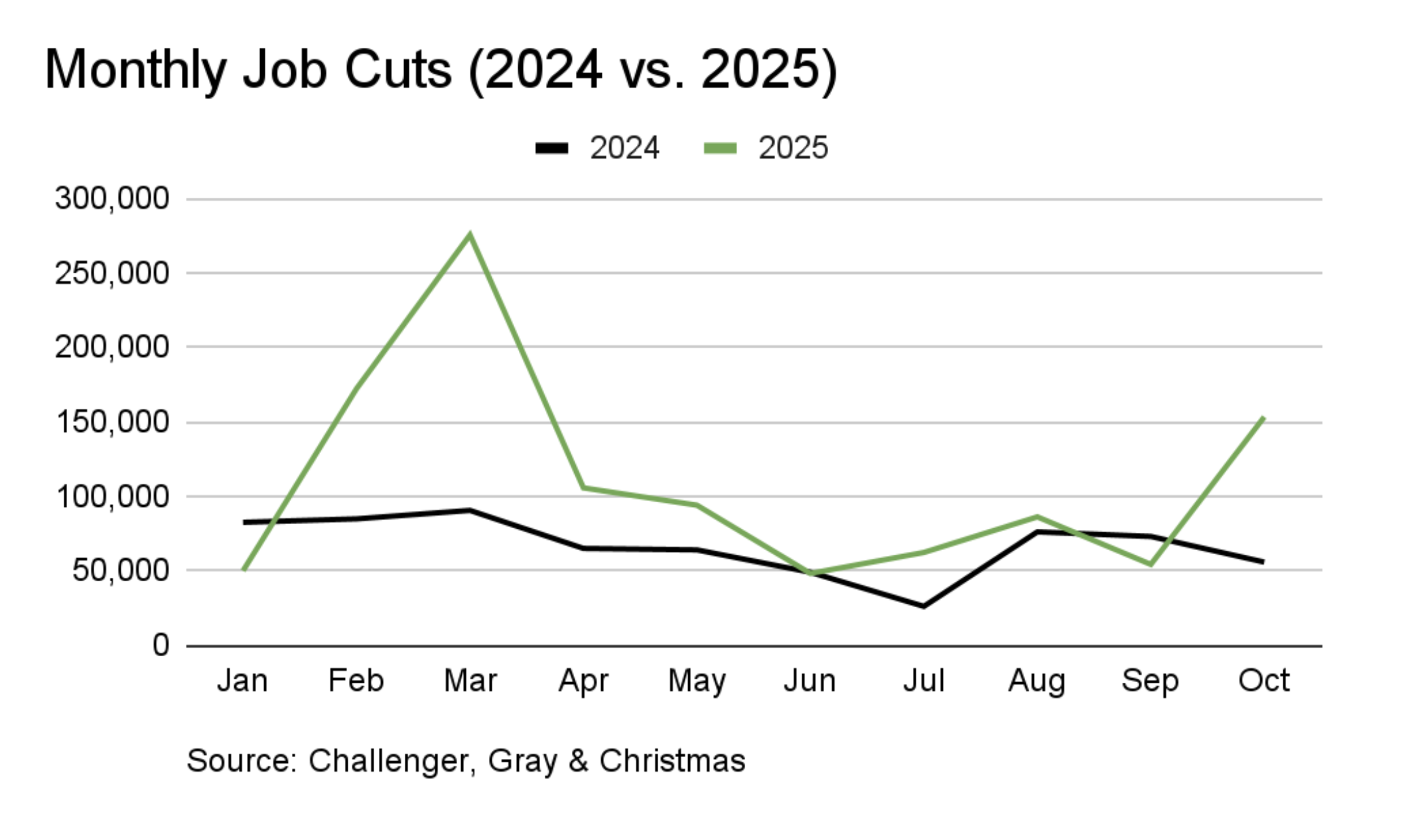 The headline was that employers announced 153,074 job cuts last month, which caught investor attention given that was nearly triple September’s total and the highest October figure since 2003. Through October, total planned cuts for 2025 reached 1,099,500, up 65% from the same period in 2024 — the steepest pace since the pandemic year 2020.